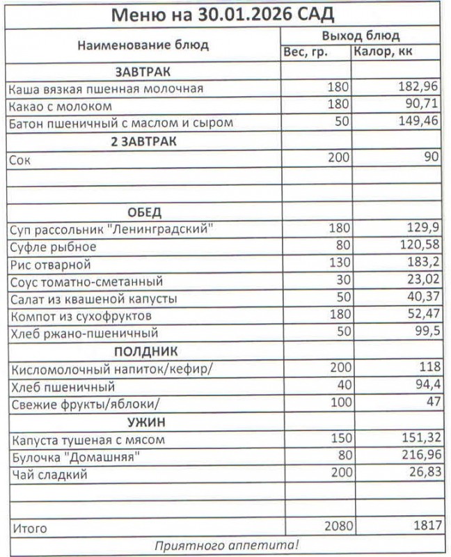 Меню на 30.01.2026 (сад)