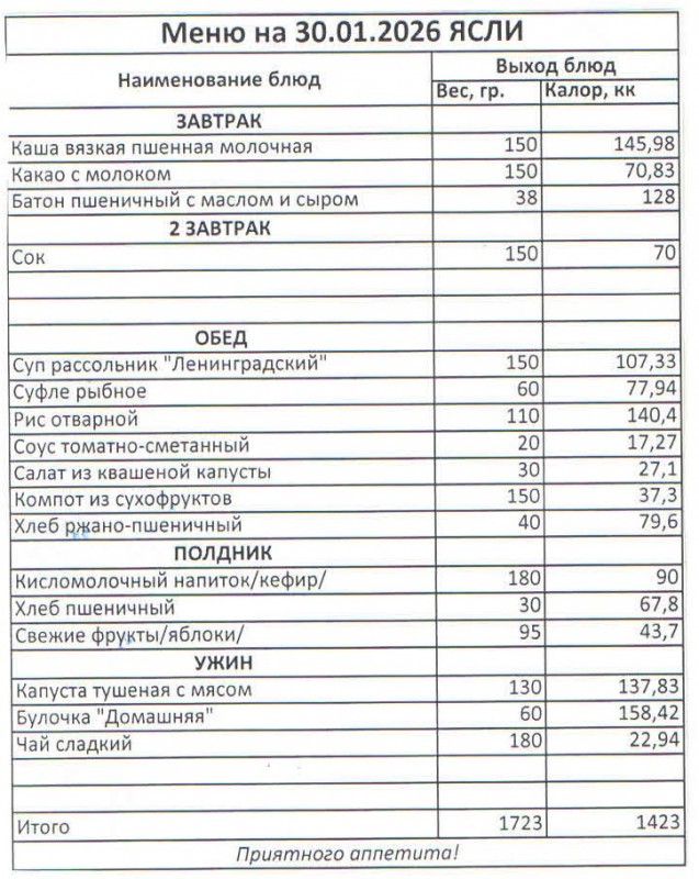 Меню на 30.01.2026 (ясли)