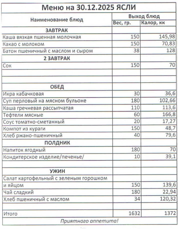 Меню на 30.12.2025 (ясли)